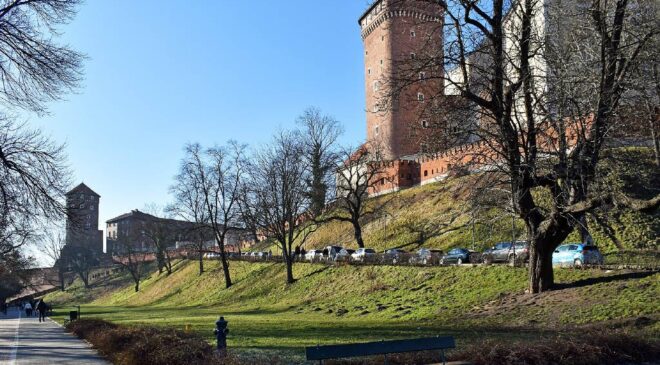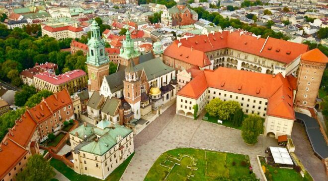 Na Wawelu, dominującym nad miastem wzgórzu, Zamek Królewski to symbol monarchii Jagiellonów i Wazów – renesansowa rezydencja z arkadowymi dziedzińcami i salami reprezentacyjnymi. Zbudowany w XIV wieku, przebudowany przez Włochów w XVI stuleciu, gościł koronacje 37 królów i liczne sejmy. Smocza Jama pod wzgórzem kusi legendą o potworze pokonanym przez Kraka, a wejście do niej to przygoda z podziemnym tunelem. W skarbcu i zbrojowni podziwia się klejnoty koronne i broń paradną, a w apartamentach prezydenckich z międzywojnia czuje się oddech niepodległości. Wawel to nie tylko zamek, ale kompleks fortyfikacji i katedry, gdzie spoczywa elita narodu.