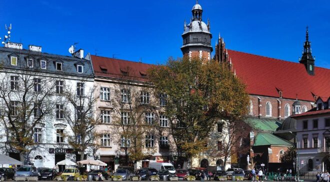 W sercu Starego Miasta bije Rynek Główny – największy średniowieczny plac w Europie, o powierzchni 4 hektarów, otoczony kolorowymi kamienicami i zabytkami. Powstał po lokacji miasta w XIII wieku jako centrum handlu, gdzie spotykali się kupcy z całej Europy. W jego centrum dumnie stoją Sukiennice – renesansowy budynek z arkadami, w którym do dziś kwitnie handel pamiątkami i rzemiosłem. Co godzinę z wieży Kościoła Mariackiego rozbrzmiewa hejnał – sygnał trębacza, który uratował miasto przed Tatarami w 1241 roku, przerywany w pół dźwięku na pamiątkę tamtych wydarzeń. Rynek to idealne miejsce na kawę w kawiarni, obserwację ulicznych artystów czy wieczorne koncerty – pulsujące serce Krakowa, gdzie historia splata się z codziennym życiem.