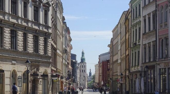Ulica Grodzka, ciągnąca się od Rynku do Wawelu, to spacer przez wieki – od średniowiecznych kamienic po pałace biskupie. Nazwana od grodu wawelskiego, była główną arterią kupiecką. Podziwia się tu Dom Jerzego Ziętka z gotyckim portalem i pałac biskupi z ogrodem. Latem tarasy kawiarniane tętnią życiem, a wieczorem lampiony oświetlają fasady. To idealna trasa na zdjęcia i odkrywanie ukrytych dziedzińców.