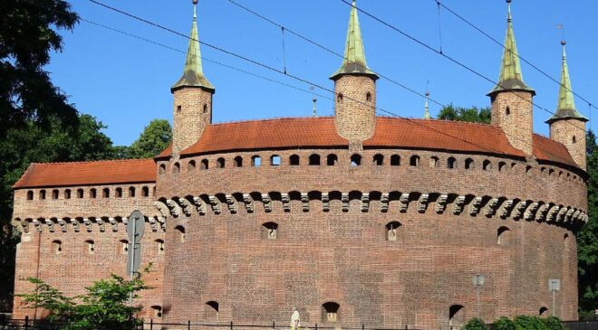 Barbakan, wzniesiony w latach 1498-1499 za panowania Jana I Olbrachta, stanowi jeden z najlepiej zachowanych przykładów średniowiecznej architektury obronnej w Europie – potężną cylindryczną konstrukcję z cegły o średnicy wewnętrznej ponad 24 metrów i murach grubości do 3 metrów. Powstał w obawie przed najazdami turecko-wołoskimi po klęsce pod Bukowiną, jako przedbramie chroniące północne wejście do miasta przez Bramę Floriańską. Siedem wieżyczek obserwacyjnych – naprzemiennie okrągłe i sześciokątne – zwieńczone machikułami umożliwiały wylewanie wrzącej smoły czy ołowiu na napastników, a ponad 130 strzelnic zapewniało wszechstronną obronę. Nigdy nie zdobyty szturmem, przetrwał oblężenia szwedzkie i austriackie; dziś mieści oddział Muzeum Historycznego Miasta Krakowa z ekspozycją uzbrojenia i fortyfikacji. Spacerując Plantami obok tej gotyckiej fortecy, można poczuć oddech renesansowej potęgi miasta, a wejście do środka odkrywa dziedziniec z wystawą o dawnej warowni.